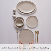 Dank der reaktiven und amorphen Formeigenschaften erhält jedes Teil ein einzigartiges Aussehen; so hebt sich jedes Geschirrset durch seine charakteristischen Farben und Muster hervor. Diese Einzigartigkeit verleiht Ihrem Tisch eine moderne und elegante Atmosphäre und sorgt bei jeder Nutzung für ein besonderes ästhetisches Erlebnis. Es ist eine besondere Wahl sowohl optisch als auch funktional.