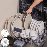 Das Geschirr ist mikrowellengeeignet, was das Aufwärmen erleichtert. Es ist jedoch nicht für die Verwendung in herkömmlichen Öfen geeignet. Es kann sicher im Kühlschrank und Gefrierschrank verwendet werden.