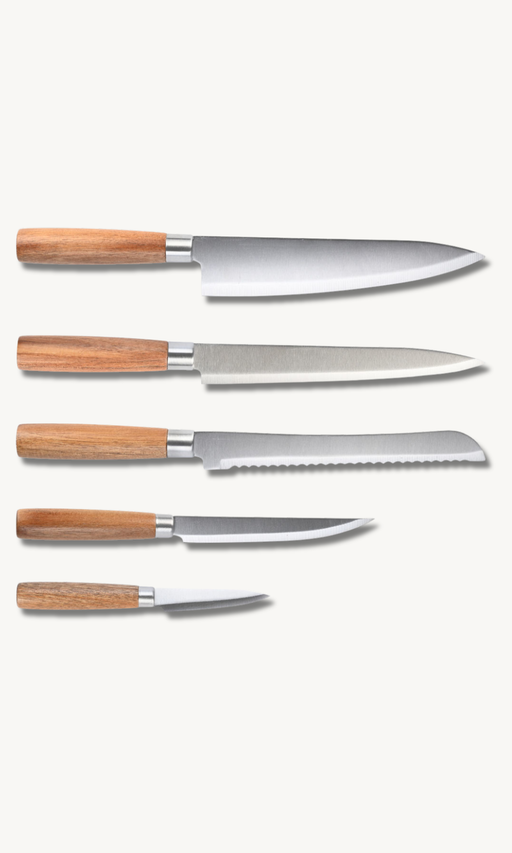 Details : 1 Kochmesser1 Tranchiermesser1 Brotmesser1 Universalmesser1 Gemüsemesser1 Messerblock Handwäsche empfohlen